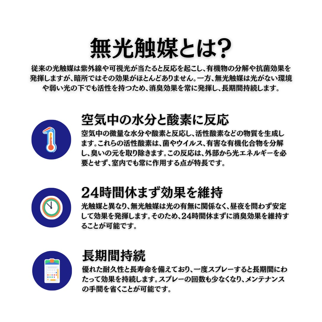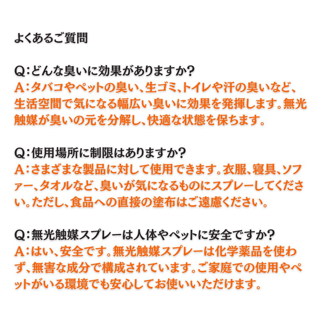 モフキーパー™は、光がなくても24時間365日効果を発揮する 画期的な無光触媒型の消臭スプレーです。無光触媒の力で、ペット臭、タバコ臭、汗やキッチンの臭いまでしっかり分解し、臭いの元から清潔な空間を実現します。